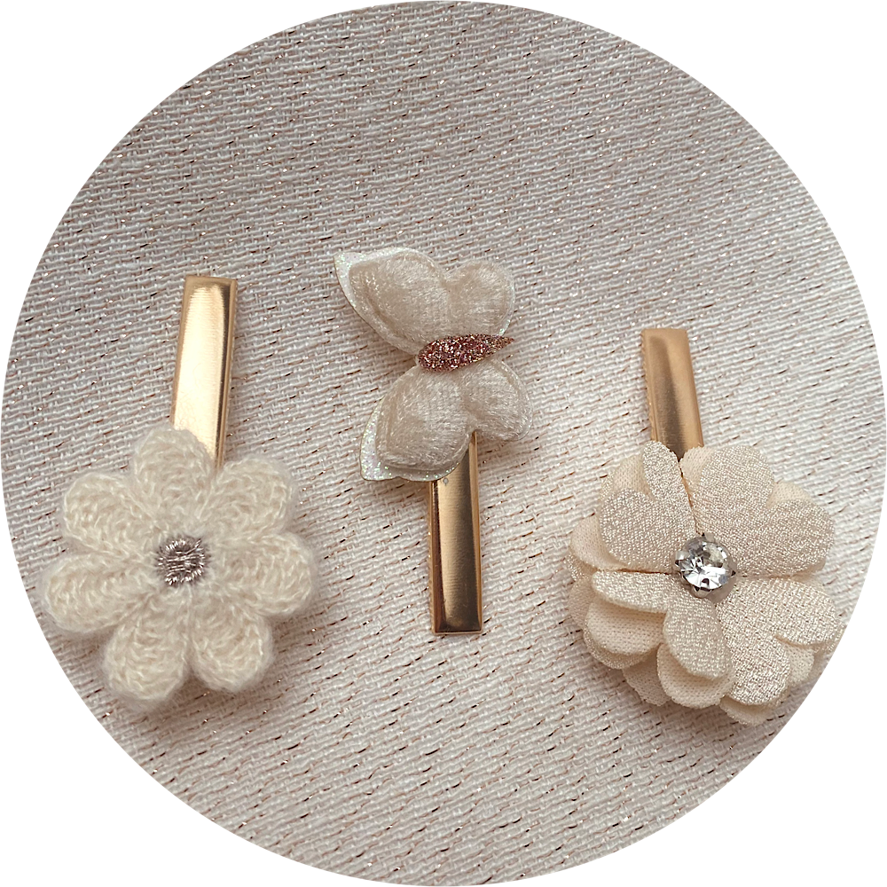 Deze charmante alligator haarspeldjes zijn de perfecte accessoire om je haar op een elegante manier te stylen. De clips zijn uitgevoerd in een luxe gouden kleur en zijn versierd met drie unieke elementen: een verfijnde beige bloem met een strass steentje in het midden, een sprankelende vlinder met glitters voor een vleugje magie, en een zachte wollen bloem die zorgt voor een speelse, gezellige uitstraling.