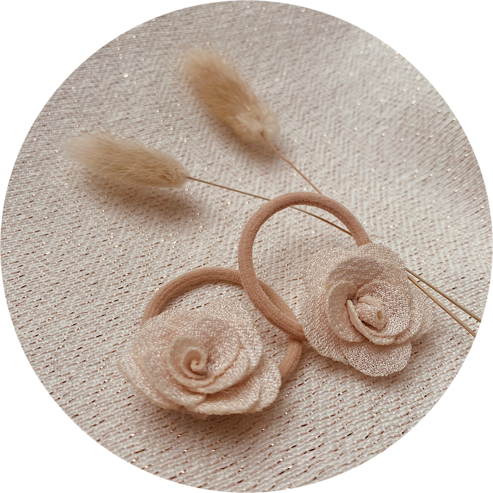 Deze schattige haarelastiekjes laten jouw meisje stralen! De zachte beige stoffen bloemen met een subtiele glans zorgen voor een elegante uitstraling, terwijl het comfortabele, elastische materiaal ervoor zorgt dat de elastiekjes de hele dag goed zitten zonder te trekken.